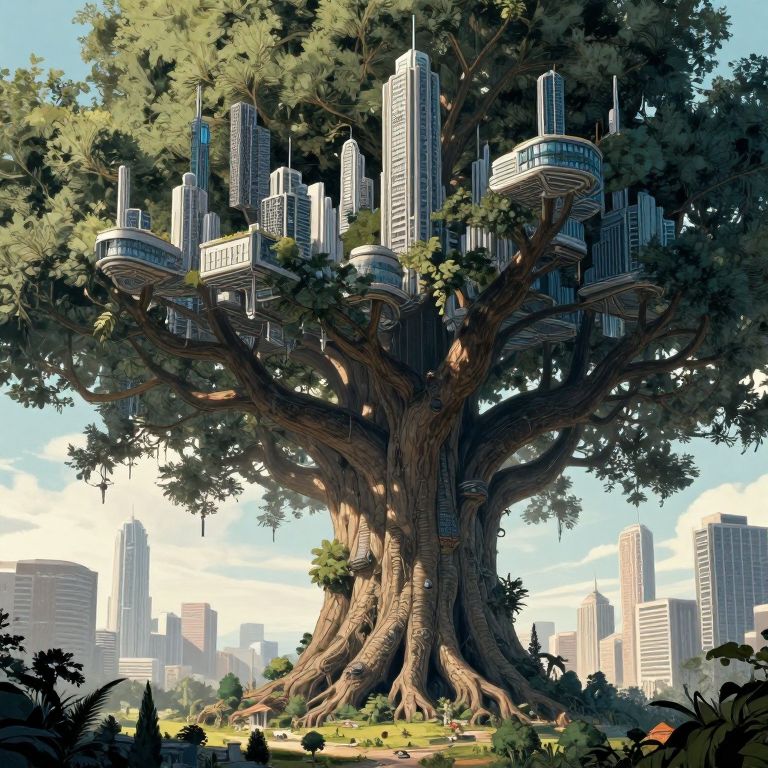 Illustration of a futuristic city integrated within the branches of a giant ancient tree. The city features sleek, modern skyscrapers and buildings seamlessly growing from the tree canopy, combining elements of nature and advanced architecture. Surrounding the tree is a park area with small people and city skyline visible in the background.