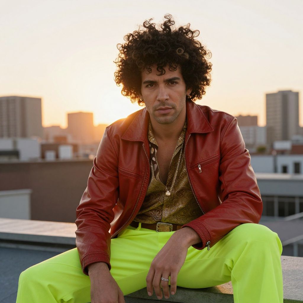 A diverse man with thick, defined curly hair styled in a modern afro with a stylish, high-volume twist, dressed in a retro 80s movie star costume featuring a leather jacket and neon green pants, sitting on a rooftop in a city at sunset, golden hour lighting, detailed facial features with dark curly hair and a confident expression