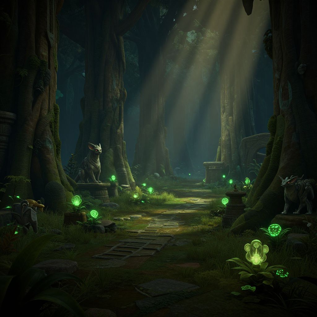 3d gaming image of a mystical forest environment inhabited by mythical creatures, glowing plants and ancient ruins, rich color palette with deep shadows and volumetric light beams, immersive fantasy atmosphere with high polygon count models and realistic shaders.