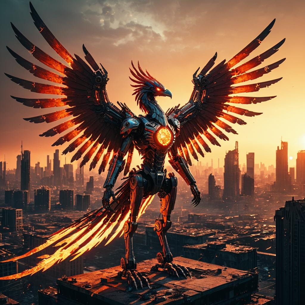 A high-tech artificial bird in photorealistic digital art style, featuring sleek drone-like falcon with articulated steel wings hovering close-up, with sleek titanium-plated feathers with holographic patterns and LED tail lights blinking sequentially, set in a dimly lit warehouse with fog, punctuated by glowing blue circuitry patterns on walls, 8K resolution
