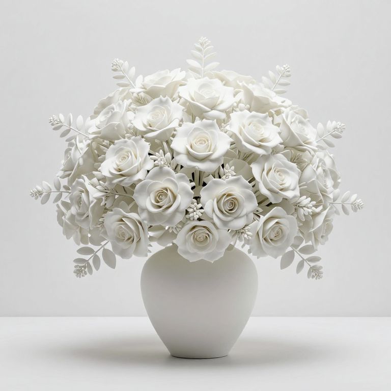 Wide-Angle Dynamic Range high hiperealistic white flower bouquet sculpture over a white brackgorund, musuem style,