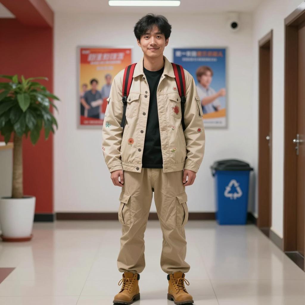 Funny clothes costume, photograph of an Asian man standing in a hallway, casual outfit, beige jacket with floral patterns, red backpack, beige cargo pants, brown boots, short black hair, slight smile, background with posters and signs, red and white walls, potted plant on the left, blue recycling bin in the background, overhead lighting, realistic style, soft lighting, indoor setting