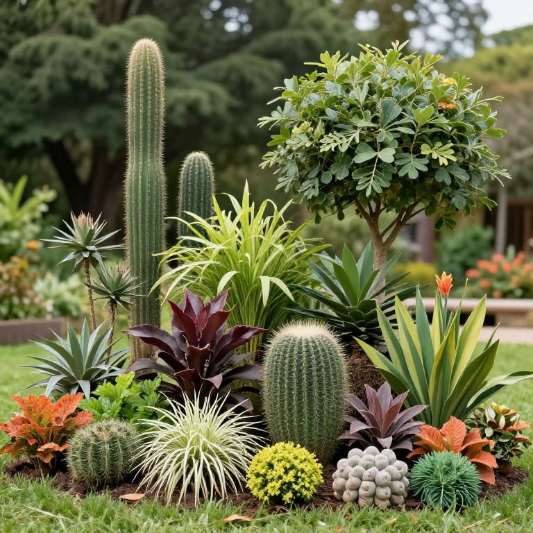 A collection of exotic plants, flowers, and trees arranged in an artistic composition, showcasing their textures and colors in a natural outdoor setting