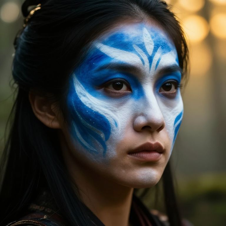 Photograph of a young woman with medium brown skin and dark brown eyes, her face painted with striking blue and white tribal patterns. Her black hair is partially tied back, with loose strands framing her face. She has a serious, contemplative expression. The background is blurred with warm, yellowish bokeh lights, suggesting an outdoor setting at dusk or dawn. The makeup is bold and symmetrical, with blue lines extending from her eyes and white markings on her forehead. She wears a dark, patterned garment that is only partially visible. The image has a high-contrast, vibrant quality.