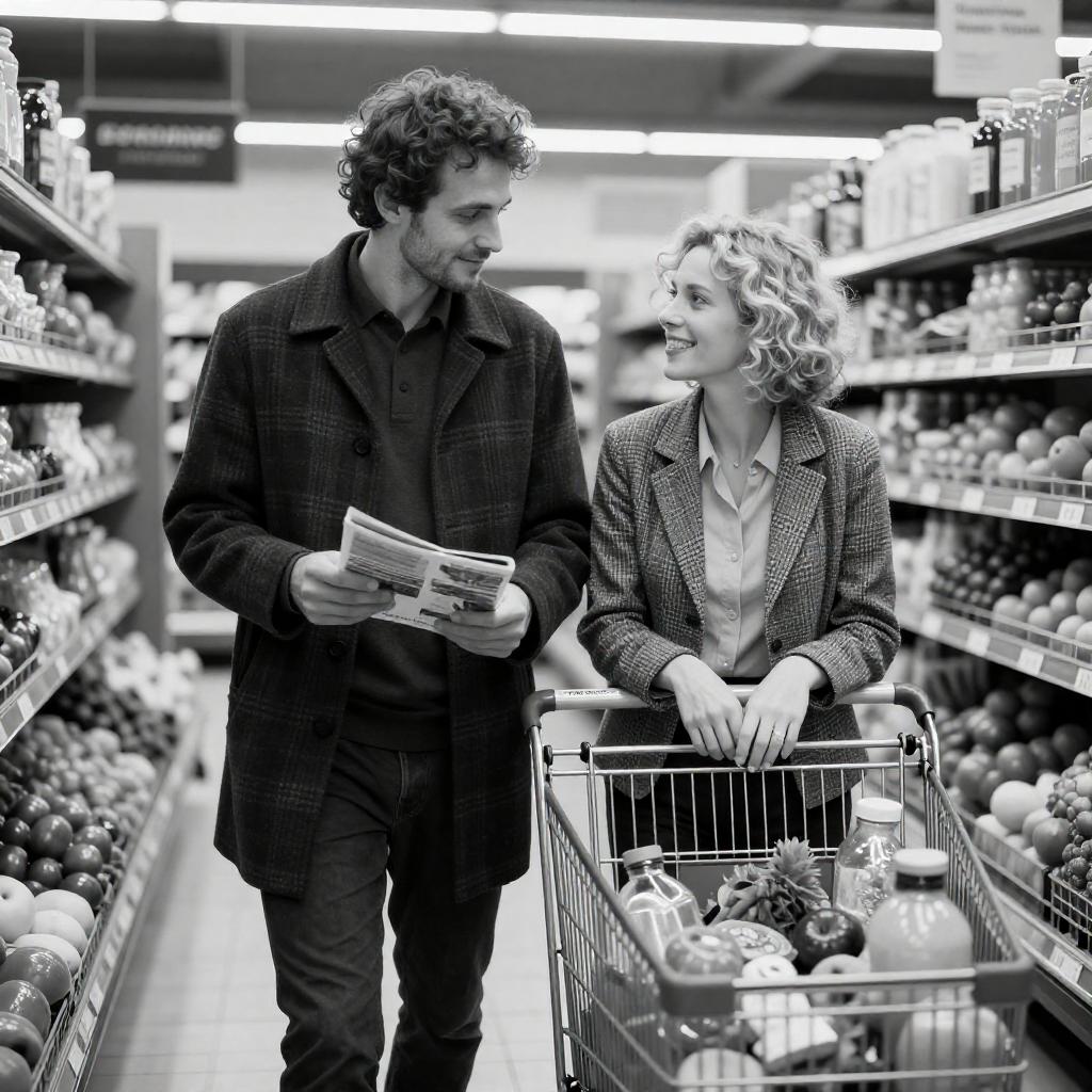 Black-and-white photograph of a grocery store aisle. Woman with shoulder-length hair, wearing sunglasses, polka dot top, and high-waisted skirt, stands beside a man with short hair, wearing a button-up shirt and jacket, pushing a shopping cart. Both smiling. Shelves with packaged goods on both sides. Another person in the background.