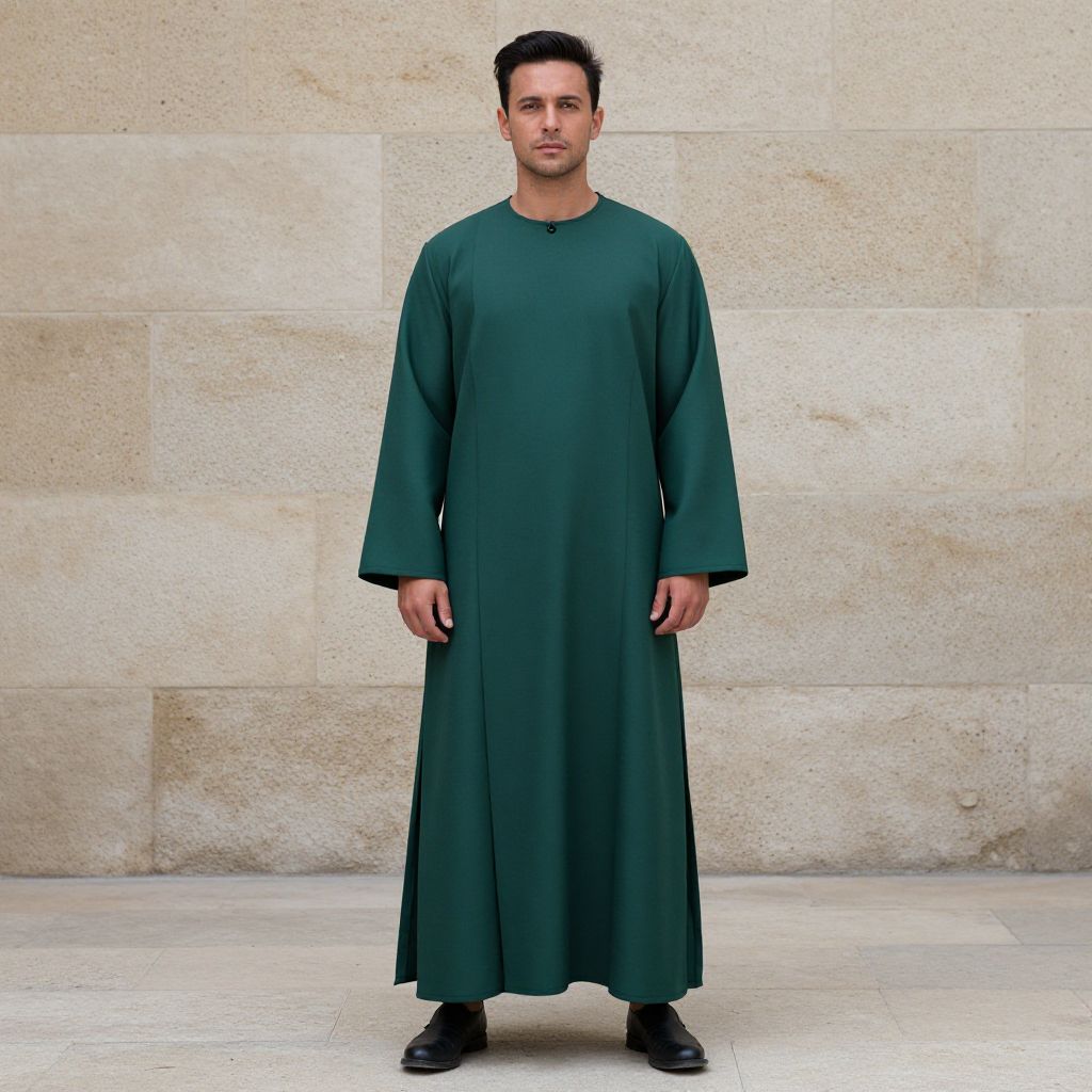 Tunics Costume, man in a green robe standing in front of a stone wall
