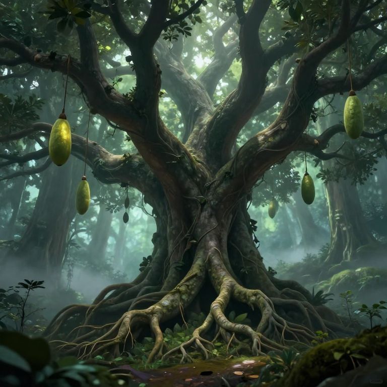 Fantasy illustration of a giant tamarindo tree with sprawling roots and oversized pods glowing faintly, mystical forest backdrop with soft mist and ethereal light rays, surreal and magical atmosphere blending realism with fantasy elements.