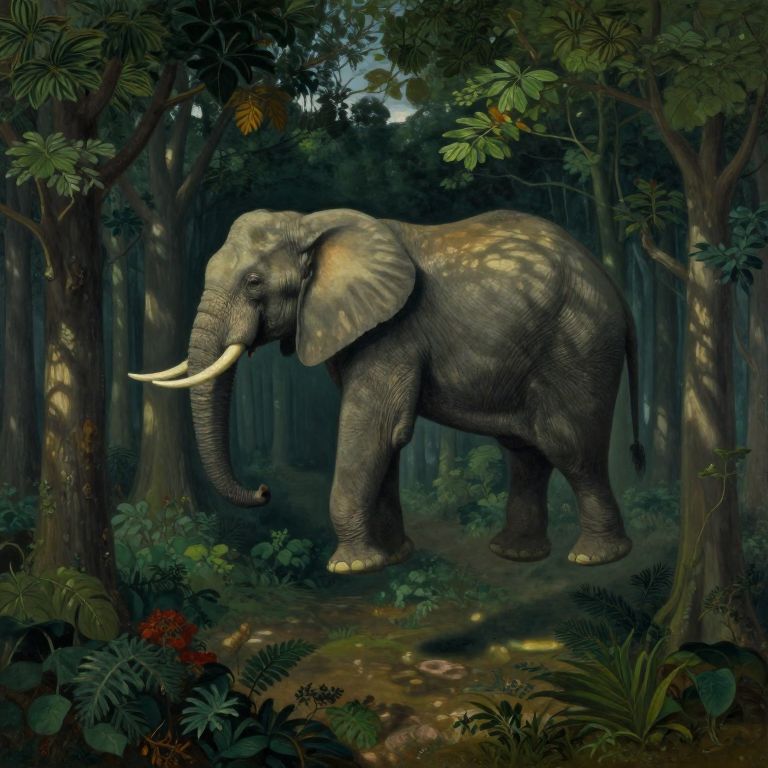 Visualize an enigmatic oil painting capturing a surreal dreamlike landscape where a magnificent elephant defies gravity and floats gracefully above the primordial forest floor. From a vantage point akin to a bird's-eye view, observe the delicate interplay of light filtering through dense foliage, casting intricate shadows on the levitating creature as it drifts serenely amidst the ancient trees. This ethereal scene evokes both wonder and contemplation, inviting the viewer to question reality and ponder the nature of existence in this captivating visual conundrum that mirrors the dreamlike qualities of Magritte's landscapes.