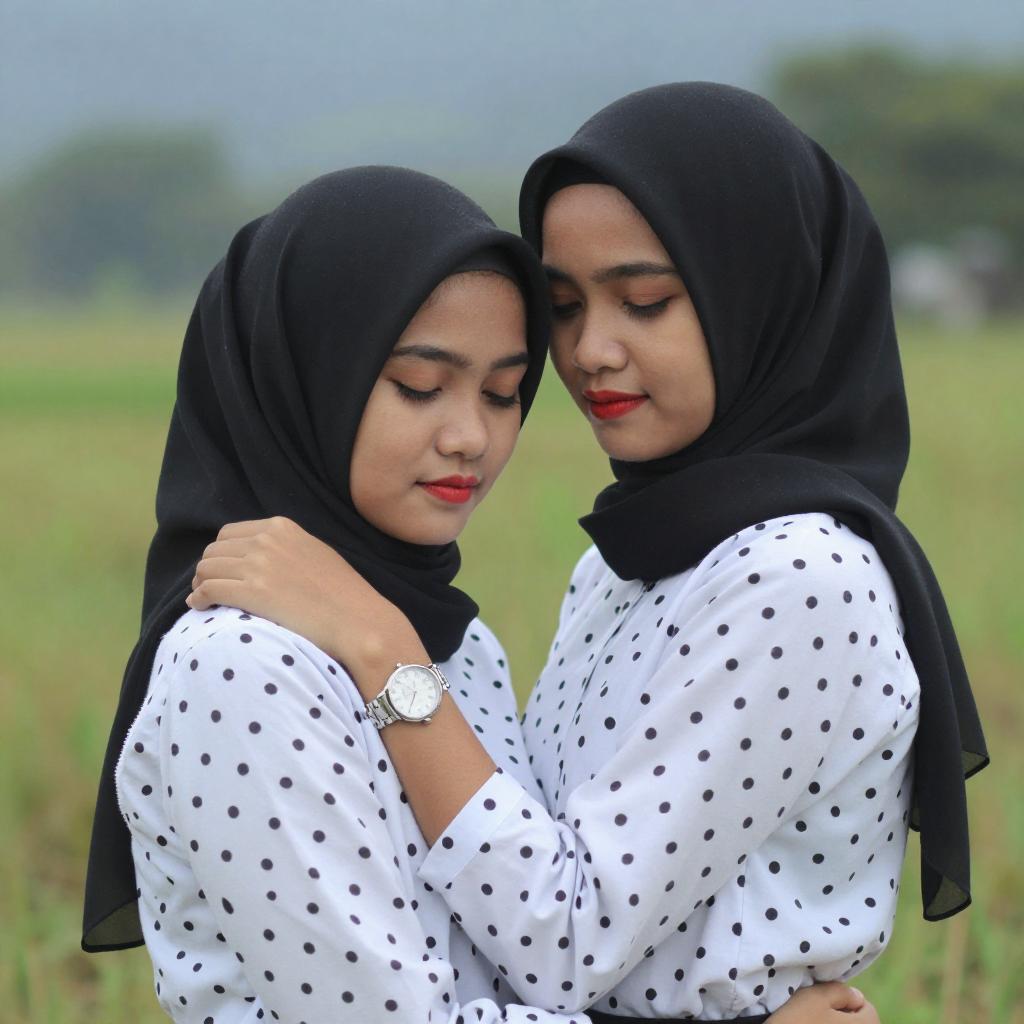 Photograph of two young Southeast Asian women with fair skin, wearing black hijabs and white polka-dotted shirts. They are embracing closely, with the woman on the left wearing a silver wristwatch. Both have red lipstick and closed eyes, exuding a sense of affection and calm. They stand in a grassy field with a blurred green and blue background.