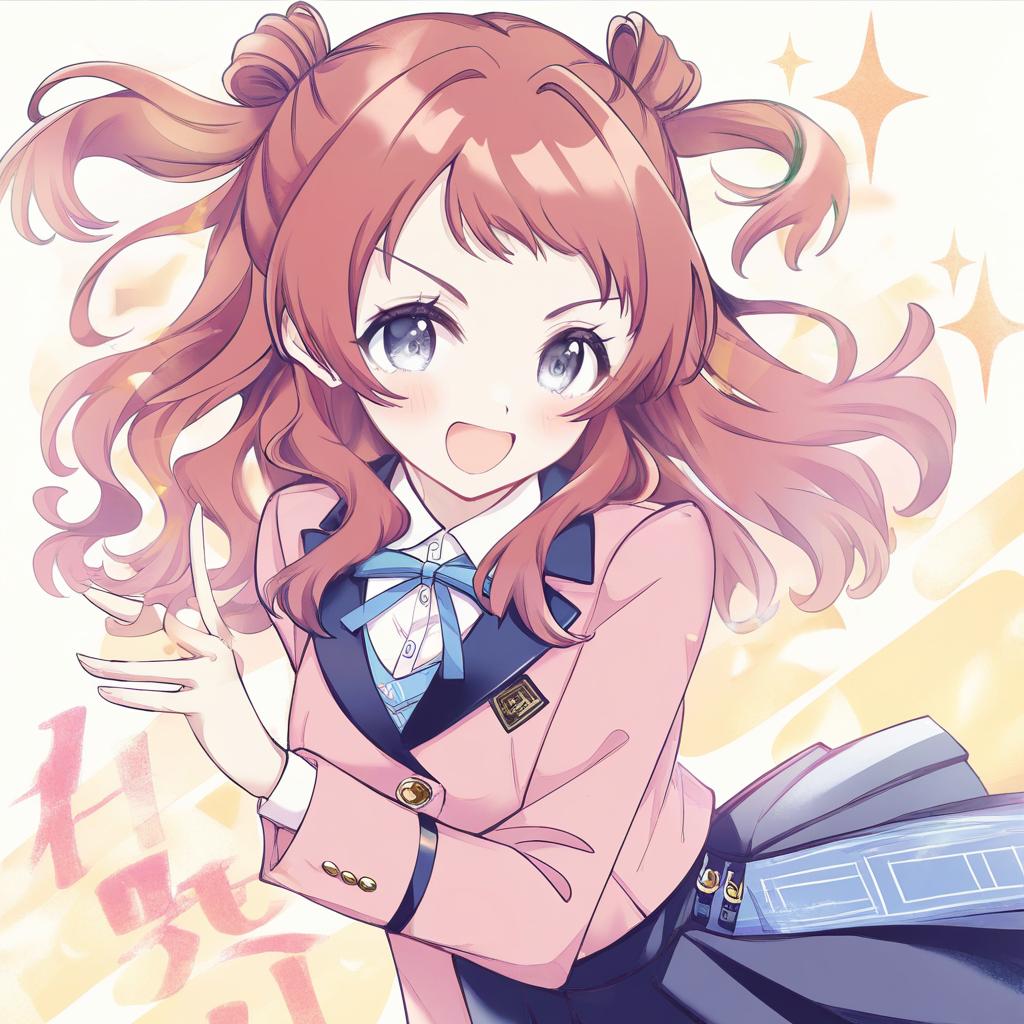 Hanami saki, gakuen idolmaster, 1girl, blue eyes, long hair, brown hair, red hair, two side up, double bun, school uniform, pink jacket, long sleeves, by artist lansane, leet
