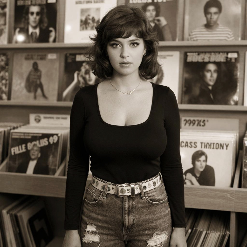 A svelte woman in a black scoop-neck top and distressed skinny jeans, accessorized with a printed waist belt and minimalist gold necklace, captured in a sepia effect at a 1980s local record store. Sexy. Pretty face and beаutiful eyes. Big breasts