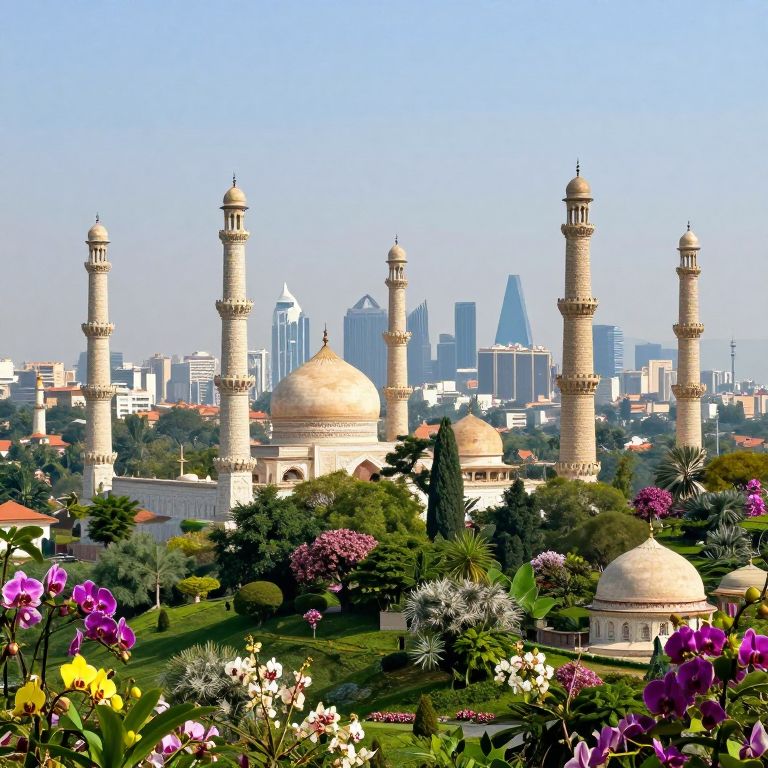 Photograph of a vibrant cityscape featuring a historical mosque with four tall, beige minarets and three large domes in the foreground. The mosque is surrounded by lush green gardens with blooming flowers in purple, white, and yellow. In the background, a modern city skyline with tall glass skyscrapers rises against a clear blue sky. The contrast between the historical mosque and contemporary buildings is striking, highlighting the blend of old and new architecture. The image captures vivid colors and textures, emphasizing the beauty of the floral foreground and the architectural details of the mosque.