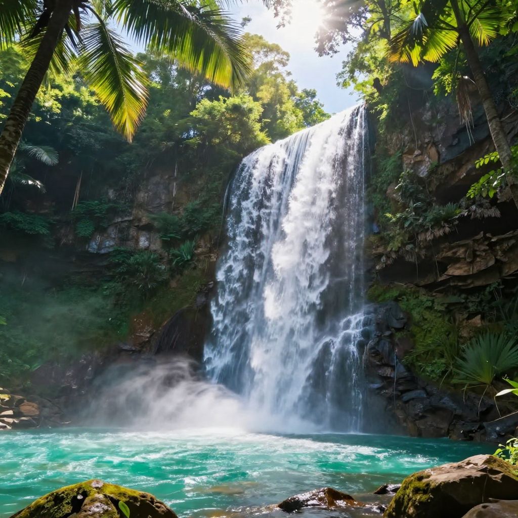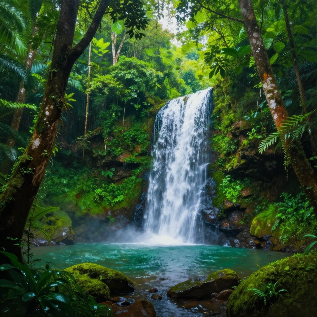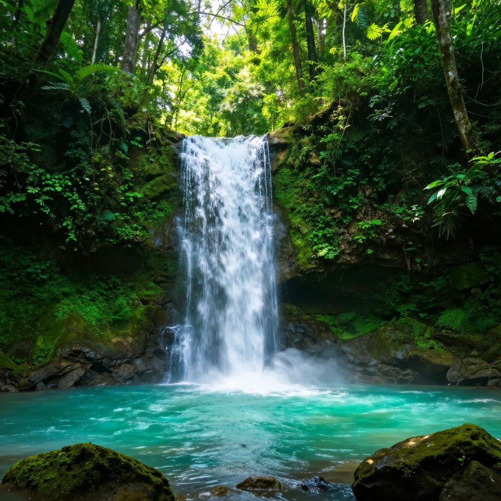 Wcw serene forest waterfall with crystal clear water, lush green foliage surrounding, soft sunlight filtering through the trees, mist rising from the pool below, tranquil nature scene, ultra-realistic detail, peaceful and calming mood