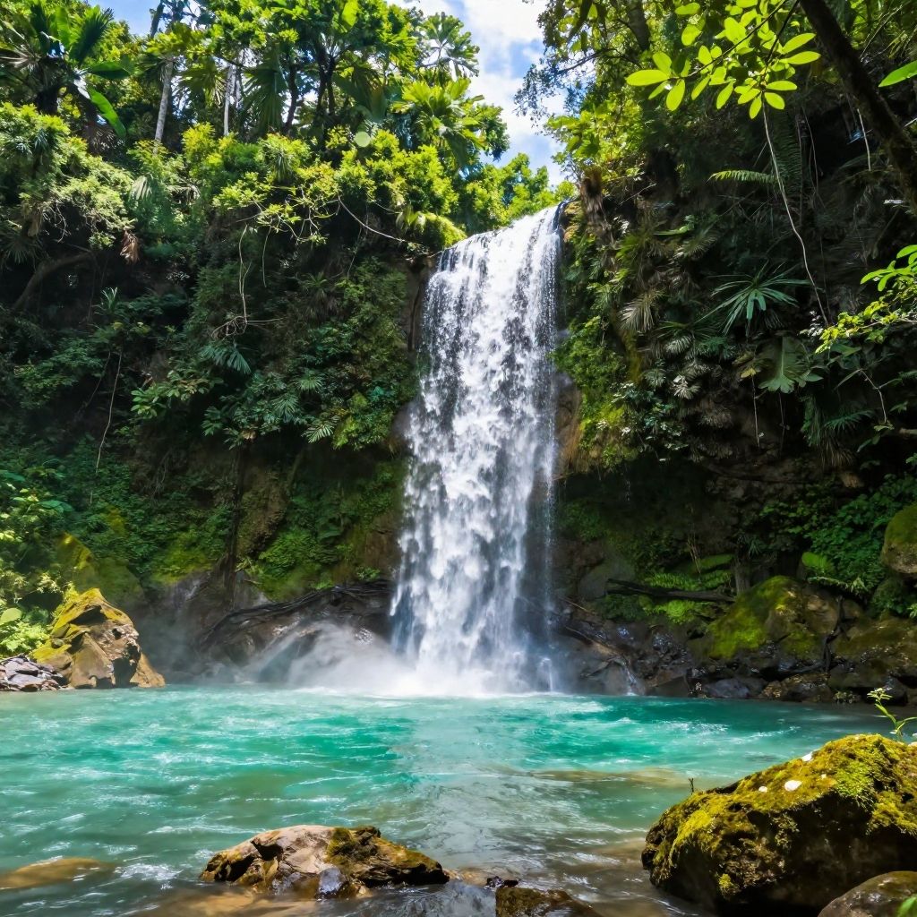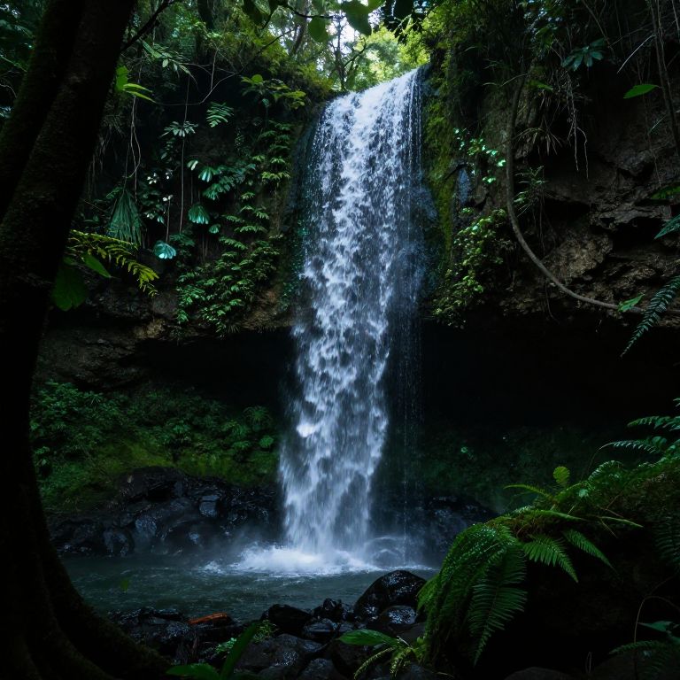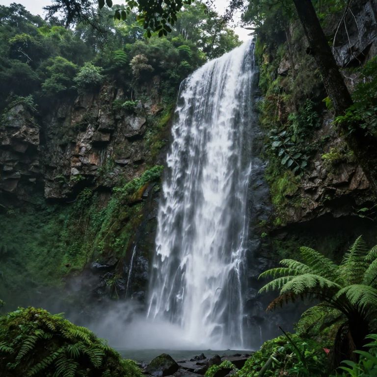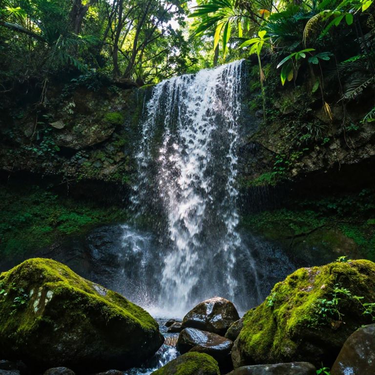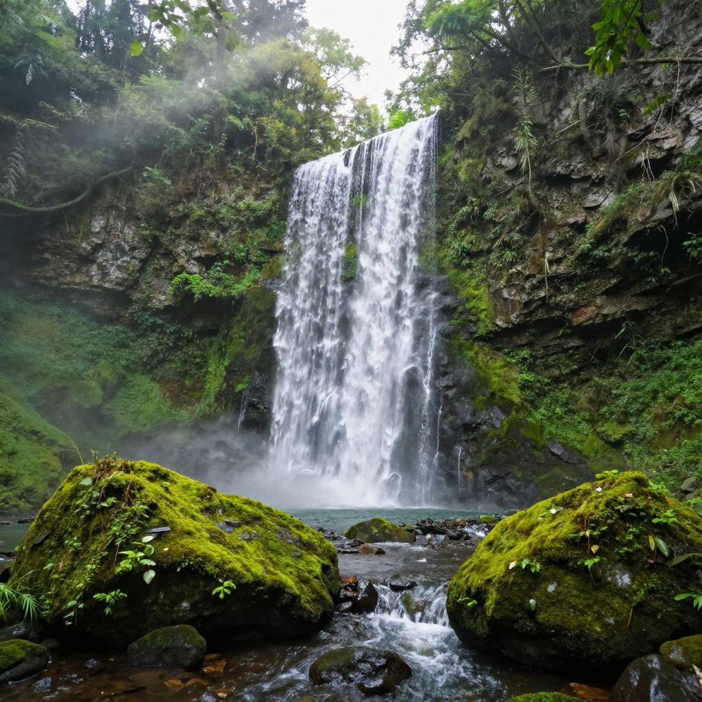 Wcw serene forest waterfall with crystal clear water, lush green foliage surrounding, soft sunlight filtering through the trees, mist rising from the pool below, tranquil nature scene, ultra-realistic detail, peaceful and calming mood