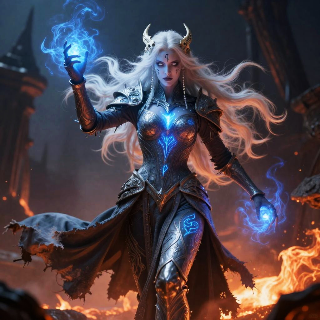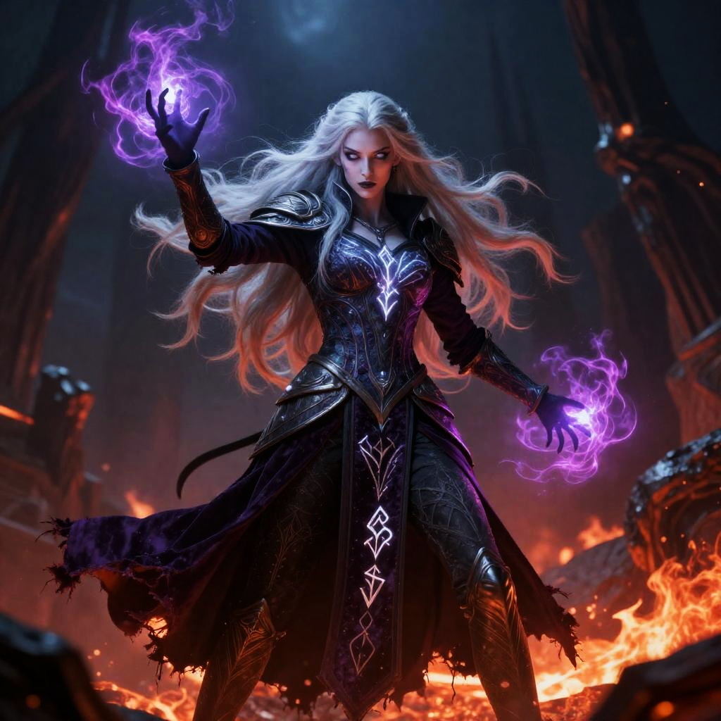 Arcane shadow priest in ornate shadow-stitched elven regalia with spectral silver filigree and ghostly white runes, wielding multicolor soul-arcane aura in a battle-ready stance. Long flowing silver-white hair braided with ethereal chains, glowing bright violet eyes, standing against a backdrop of twilight forest glades with ancient elven ruins. Unreal Engine render, 8K, volumetric shaders, cinematic lighting, splash screen, cover art.