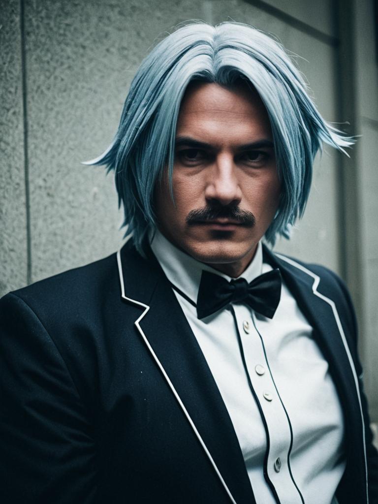 Portrait of a man dressed in a cosplay inspired by anime character Anya Forger, featuring a sharp dark blue suit with white piping, white shirt, and a red and yellow striped tie. The subject has light grey hair styled to mimic the character's look and sports a mustache. The photo has a cinematic realism style with a neutral background.