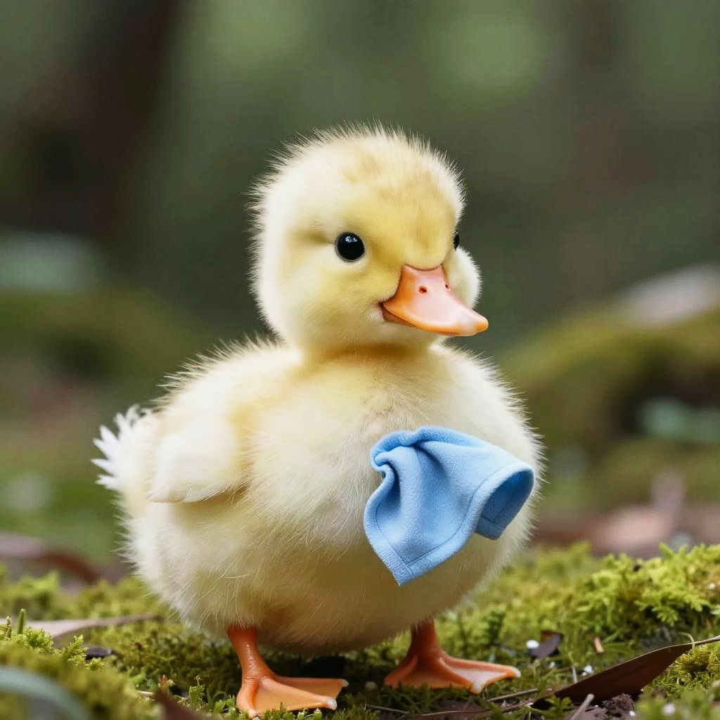 A cute, detailed digital drawing of a chubby, white duckling with big, shiny black eyes, an orange beak, and small pink ears. The duckling is holding a light blue cloth in its tiny webbed feet. It's sitting on mossy ground with a blurred, green forest background. The lighting is soft, highlighting the duckling's glossy feathers and innocent expression.
