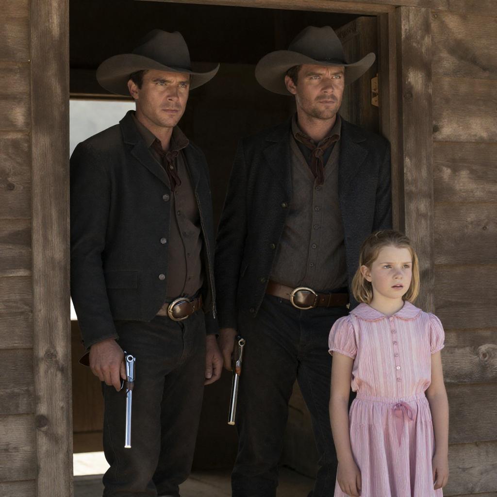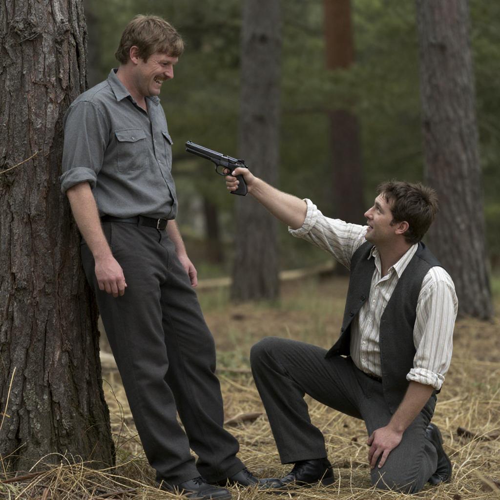 Photograph of a movie scene. Central man with brown hair, carrying a straw bundle, brown jacket, dark pants, walking on rocky path. To his left, woman with long red hair, green blouse, white skirt. To his right, man with blue shirt, white pants, smiling. Another man in striped shirt, white cap, facing central man. Horse with saddle in background. Sunlight casting shadows.