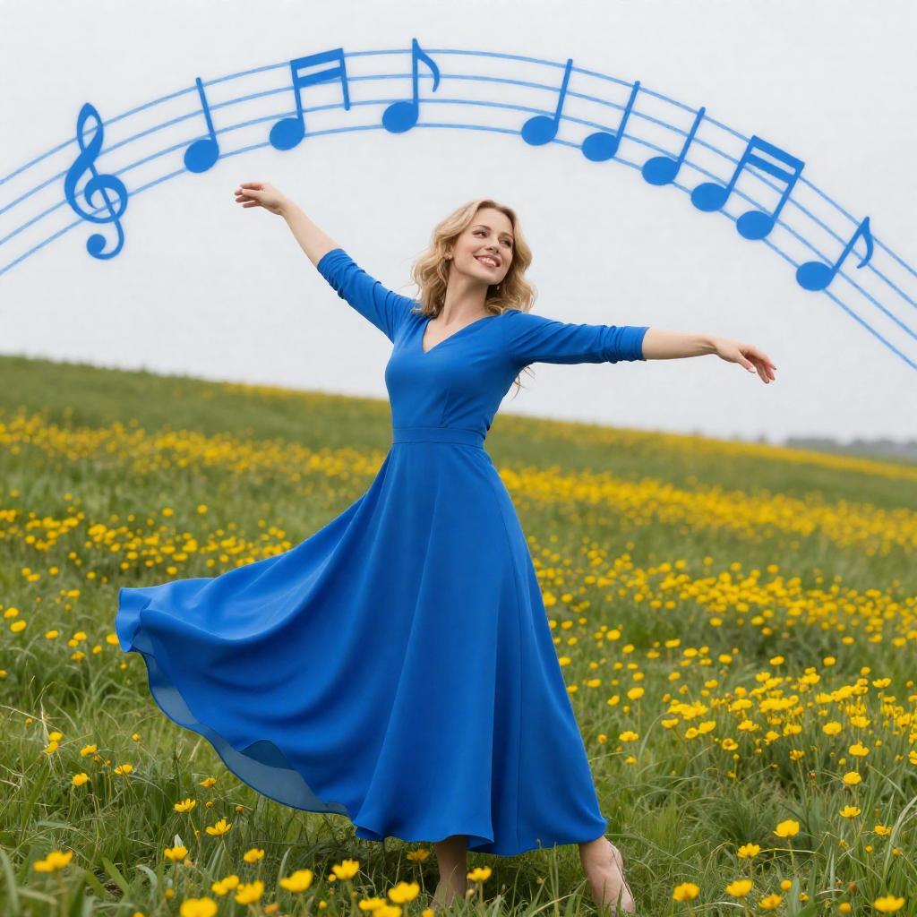 Woman in blue dress with long sleeves and flowing skirt, blonde hair, smiling, arms outstretched, standing on a grassy hill covered in yellow flowers. Blue musical notes and arcs in the background. Bright, cheerful scene.