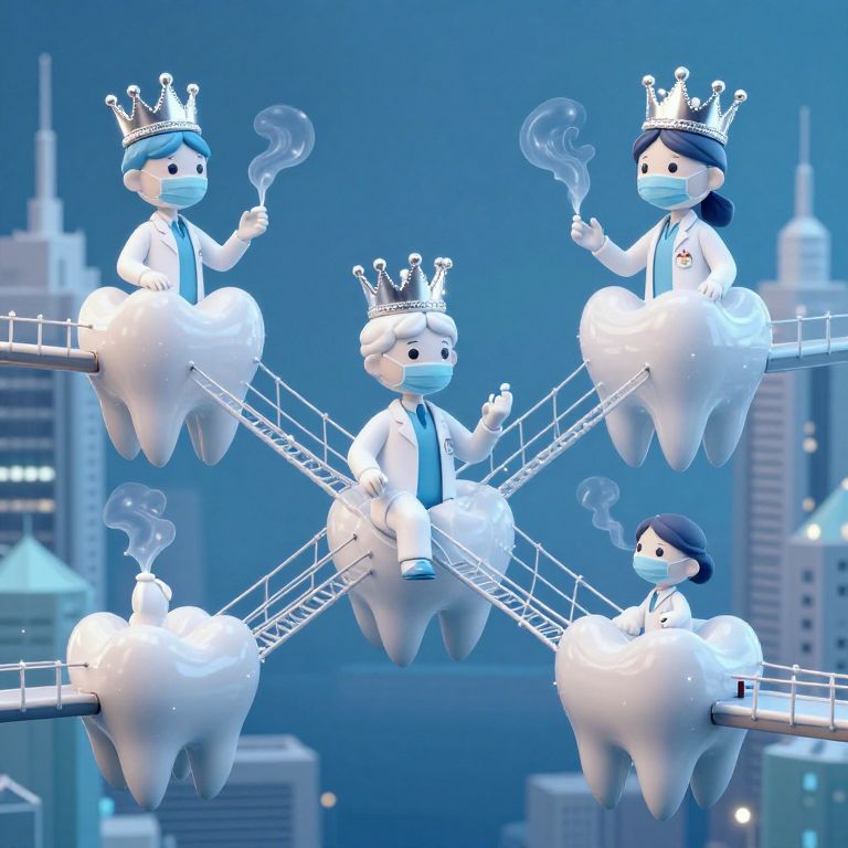 This is a digital CGI image depicting four cartoon-like, white tooth characters with crowns, wearing blue masks and white lab coats with blue ties. Each tooth is floating in mid-air, connected by a network of white suspension wires forming a crisscross pattern. They hold glowing, smoke-like wands in their right hands. The background showcases a blurred cityscape with tall, illuminated skyscrapers against a gradient blue sky. The characters have simple black eyes and small, rounded noses. The image has a playful and surreal style with a focus on dental and medical themes.