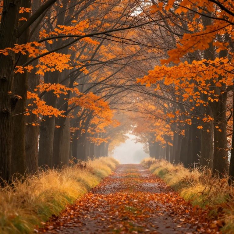 Autumn Walk XXV. by realityDream captures a serene forest path flanked by towering trees with vibrant orange foliage, their branches arching overhead to form a natural canopy, while a carpet of fallen leaves and golden grasses lines the pathway leading into a misty, sunlit distance.
