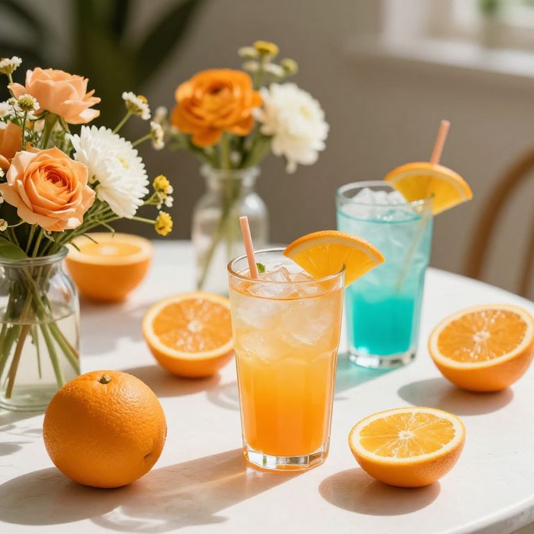 Vibrant hues of orange and turquoise dance across a table adorned with floral blooms and citrus-infused drinks, evoking a sense of renewal and joy, where the warmth of sunlight and the zesty aroma of fresh fruit invite a moment of serene celebration.