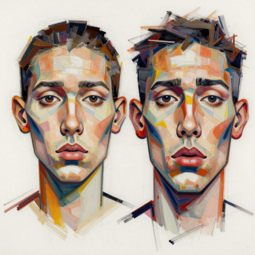 This digital painting in a vibrant, cubist style depicts two identical male faces side by side against a white background. Both men have short, dark brown hair, fair skin, and serious expressions. Their faces are composed of bold, colorful blocks of paint, including shades of orange, blue, pink, and yellow, creating a dynamic, textured effect. The men's eyes are dark and centered, their noses are straight, and their lips are full. The painting uses thick, expressive brushstrokes, giving it a lively, almost abstract feel. The men wear simple, unidentifiable shirts, and their necks are slightly turned, adding a sense of depth and realism to the otherwise stylized representation.