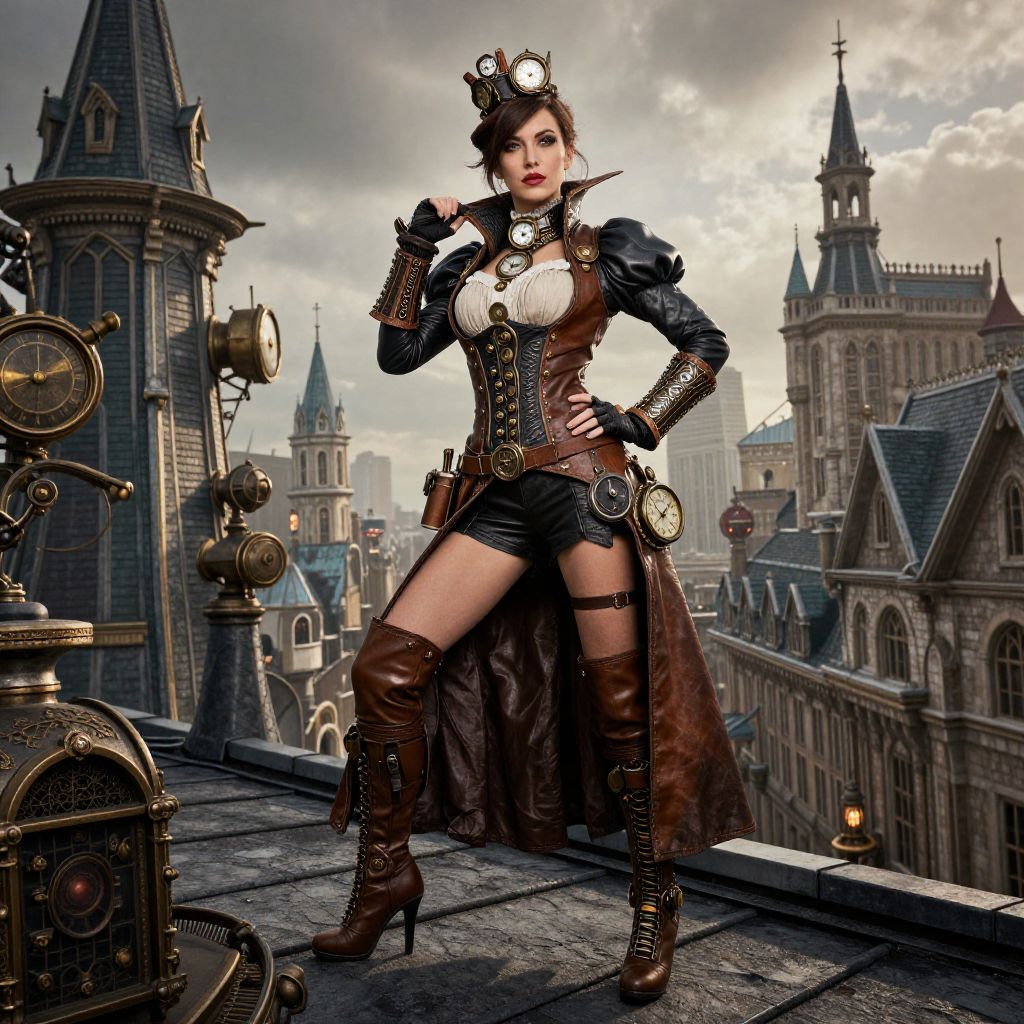 A striking steampunk-inspired scene featuring a woman in an elaborate costume, characterized by leather and clockwork accessories. She poses confidently atop a rooftop with an intricately designed cityscape in the background, showcasing Victorian architectural elements blended with fantastical technology. The dramatic lighting further enhances the mysterious and adventurous atmosphere of the artwork.