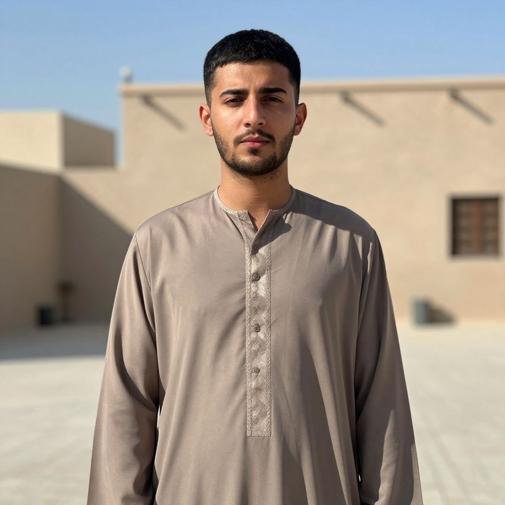 Moroccan jalabiya male, 1boy, solo, beard, male focus, facial hair, standing, black hair, long sleeves, robe, looking at viewer, closed mouth