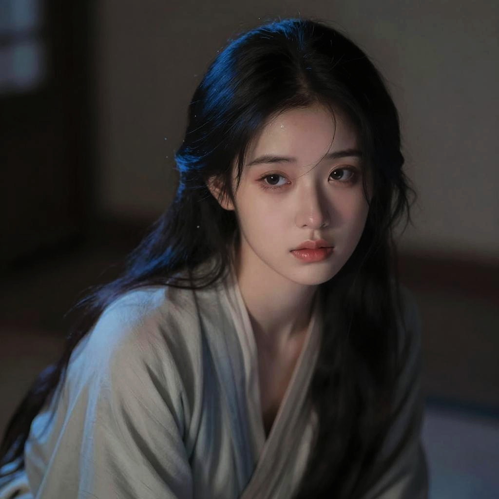 Soft anime‑style digital painting of a beautiful young young woman (Asian descent) with long flowing ink-black with cobalt blue sheen hair and expressive eyes, wearing a draped soft mist gray-blue garment, gently illuminated by diffused light in a muted, enclosed setting, her gaze direct and emotional, detailed facial features and soft textures with pastel highlights, conveying a mood of quiet vulnerability and intimacy