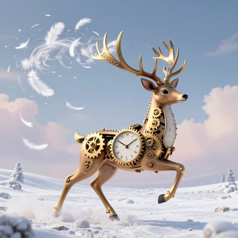 In a surreal 3D-rendered fantasy scene, a clockwork deer with intricate golden gears and a large analog clock embedded in its chest gracefully gallops across a snowy landscape, its antlers adorned with backward-ticking hands, while ethereal white feathers spiral upwards like frozen whirlwinds against a dreamy sky.