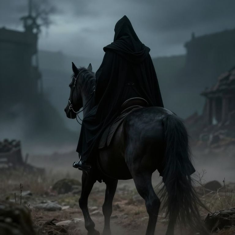 Serendipity An emmissary of the dark lord is robed in all black is riding a black horse and facing away from us. Evil.,