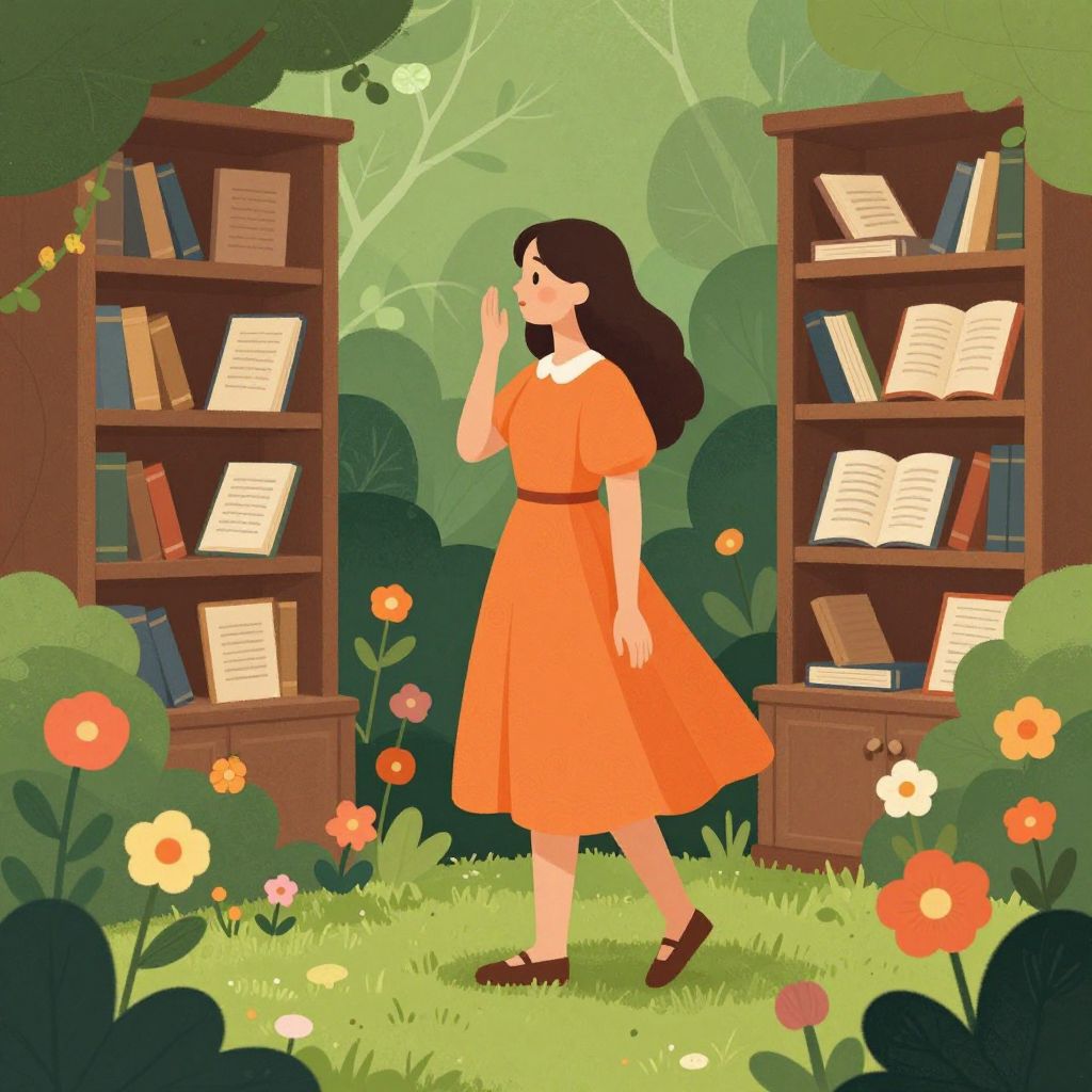 In a serene, computer-generated illustration, a young woman in an orange dress stands amidst a lush garden where vibrant flowers bloom alongside bookshelves filled with whispering tales, symbolizing the magical interplay between nature and literature.