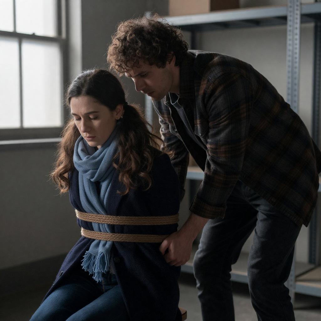 Photograph of a man in a brown leather jacket and blue jeans standing in a narrow, industrial hallway with metal mesh walls, looking down at a woman with long brown hair, wearing a brown coat and dark pants, squatting on the floor. The hallway has a blue door in the background.