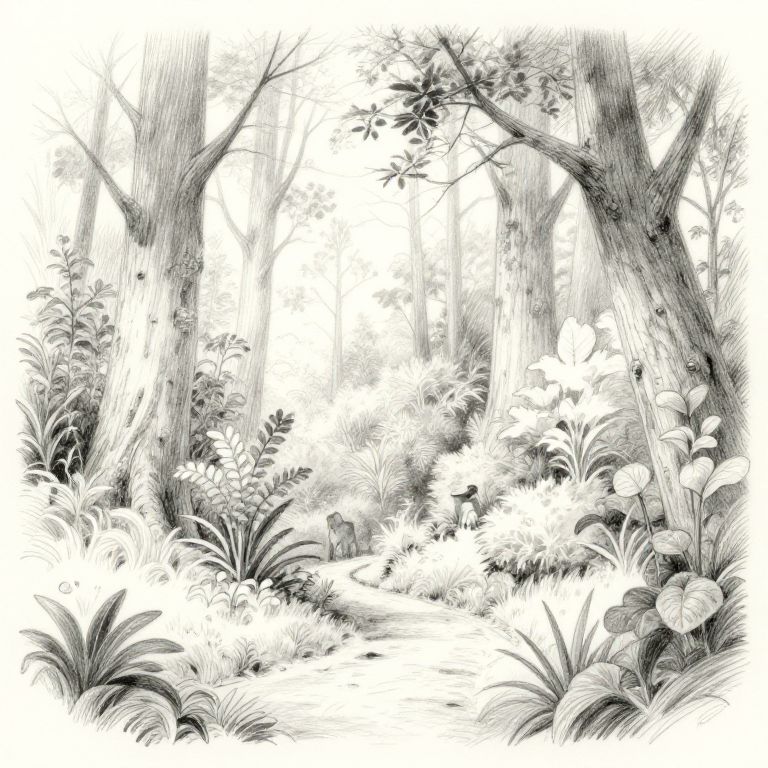 Reference sketch of a woodland scene featuring diverse flora and fauna, delicate pencil strokes illustrating towering ancient trees, winding paths, and hidden animals, soft shading and texture bringing natural depth and serene atmosphere to the composition.