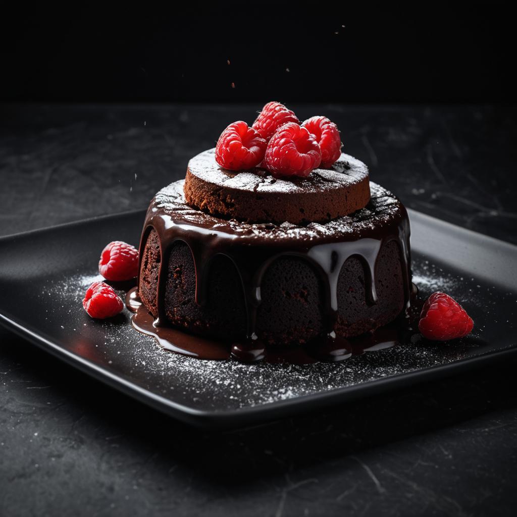 Rich chocolate mousse topped with fresh raspberries in transparent glass dessert bowl with gold rim::1, floating in the air, cinematic lighting, moody art deco studio lighting, intricate details, hyper-detailed, ultra realistic, 8K UHD