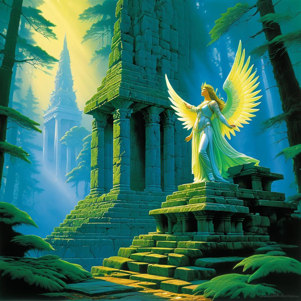 An angel at an ancient stone temple in a mystical forest by Michael Whelan, detailed and dramatic composition.