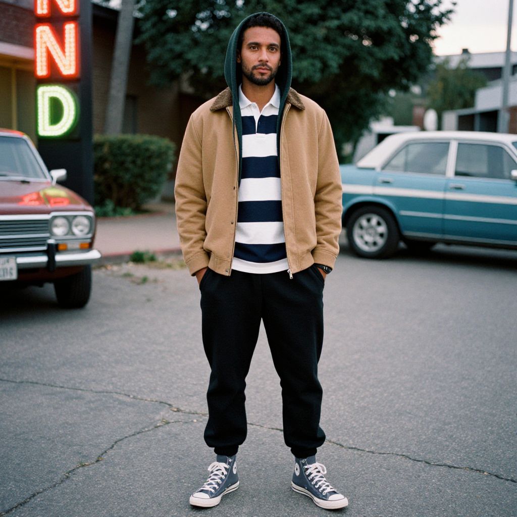 A man, Harrington jacket in camel, striped polo shirt in navy and white, relaxed-fit joggers in black, high-top canvas sneakers in gray, fleece-lined hoodie in dark green, neon-lit sign, cracked pavement, vintage cars parked, AgfaColor film, relaxed expression, casual vibe. Man has masculine face and piercing eyes