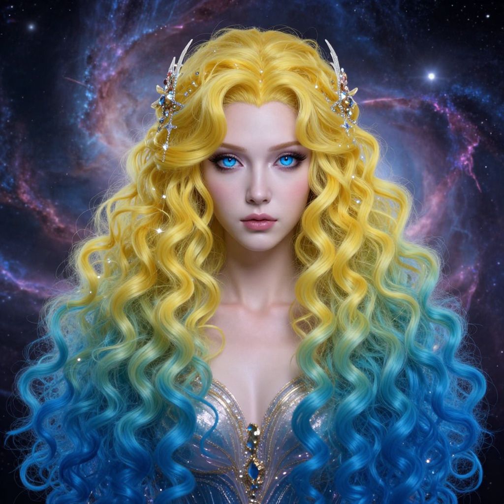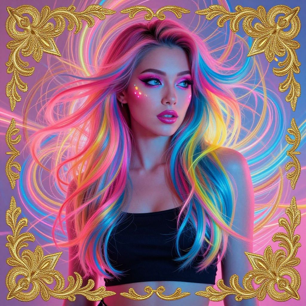 Goldwork style, metallic embroidery, luxurious, detailed, patterned score_9, score_8_up, score_7_up, score_6_up, the image features a woman with vibrant, colorful hair and striking makeup. the style of the image is highly stylized, blending elements of realism and fantasy to create a visually captivating scene. the woman's face and hair are enhanced with bright colors and lights, adding an ethereal quality to her appearance. the background consists of swirling lines in various hues, which further contributes to the fantastical atmosphere of the image. this artistic choice conveys a sense of otherworldliness and dreamlike wonder, making the photo reminiscent of a surrealistic painting or a digital art creation., colorful hair that transitions through various hues of pink, blue, and yellow. she has striking neon makeup on her face, adding to the overall surreal and fantastical appearance of the portrait. the background is awash in a mix of pink and blue, further enhancing the dreamlike quality of the image. the woman's gaze is directed off to the side, lending an air of mystery to her expression. her attire consists of a black crop top, which contrasts sharply with the bright colors surrounding her.