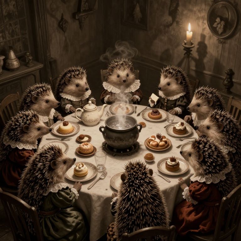 Craft an image in the enigmatic, whimsical style reminiscent of Edward Gorey's work, portraying a surreal gathering of anthropomorphic hedgehogs surrounding a lavish table filled with bubbling pots, steaming teapots, and intriguing pastries during a midnight feast. This peculiar assembly is captured from above, revealing flickering candlelight that casts elongated shadows on the walls, creating an air of mystery. The hedgehogs, dressed in intricate attire suggesting various historical periods, convey a sense of melancholy as they share secrets and stories within the sepia-toned, atmospheric setting.