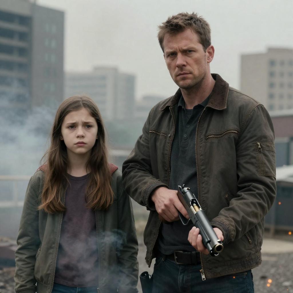 Portrait of four people standing in a forest with serious and concerned expressions. A man with a dirty tank top and bloodstains on his arm stands behind a dark-haired woman in a grey hoodie and tank top. In front is a young girl wearing a red jacket with a blue collar, and next to her is a woman in a white knitted sweater and jeans. All individuals appear dirty and distressed, surrounded by trees and forest floor.