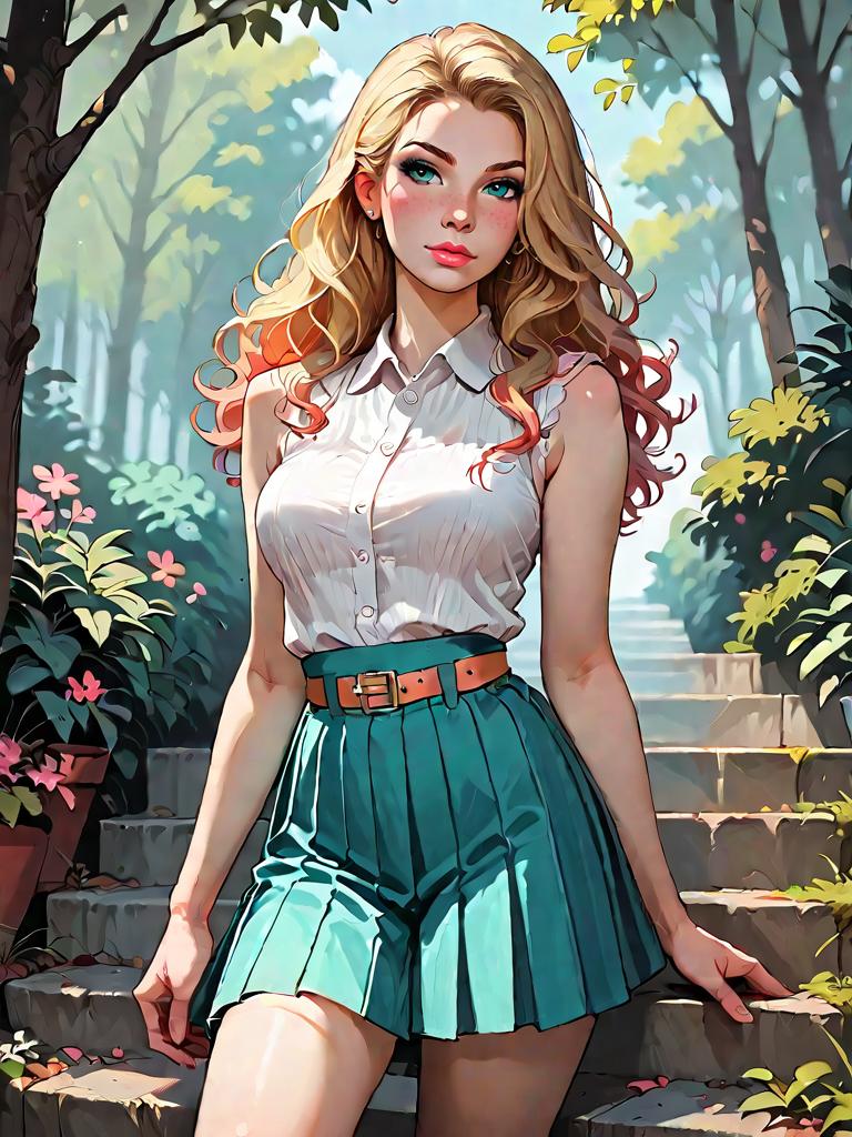 1girl, source_comics, realistic face, full body shot, Woman, casual summer, floral print bustier top in black with sweetheart neckline, thin straps, paired with a flared red skirt, knee length, high-waisted with a black ribbon belt, wavy long hair, outdoor path with trees and grass.