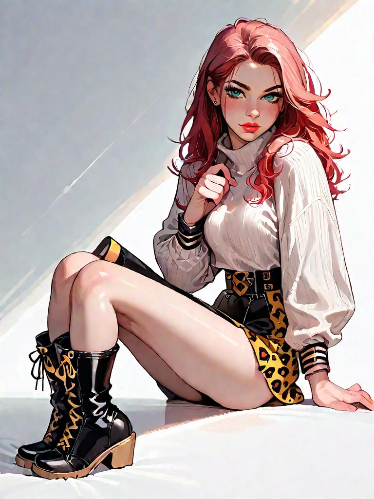 Full body digital artwork of a woman with long wavy red hair walking down a sunny outdoor path surrounded by trees and colorful flowers. She wears a floral print black bustier top with a sweetheart neckline and thin straps, paired with a high-waisted flared black skirt and black ankle boots. The background features a serene natural setting with green grass, yellow and red flowers, and a light blue sky.