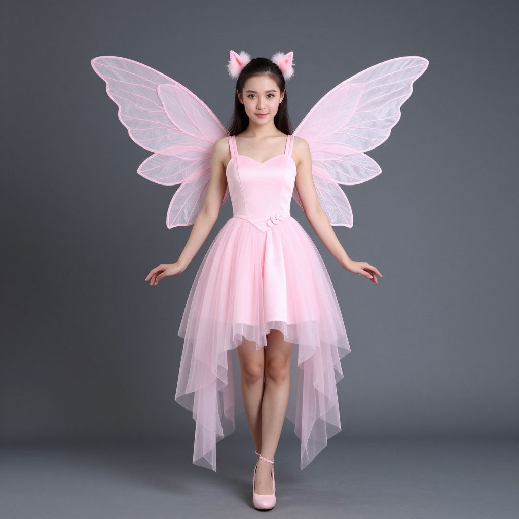 "Woman Pink Fairy Costume, woman in pink dress with pink wings and pink dress"