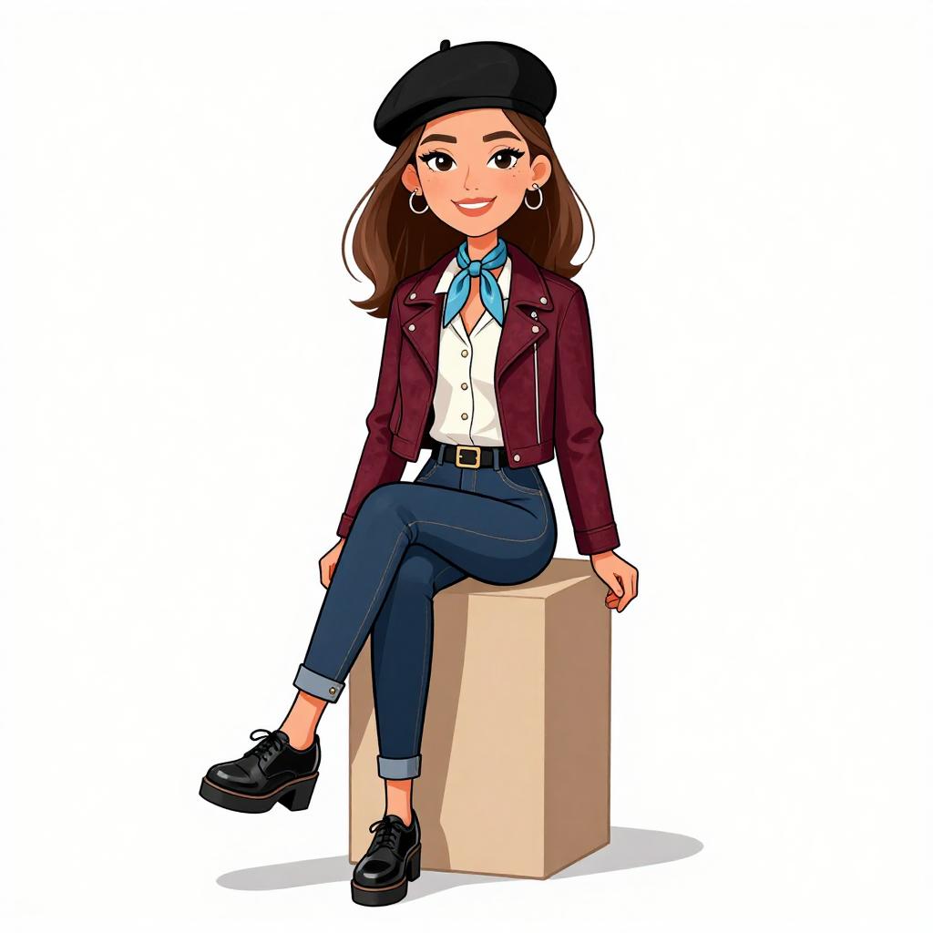 This is a digital drawing in a cartoon style. The subject is a young woman with long brown hair, wearing a black beret, large hoop earrings, and a maroon leather jacket over a white shirt with a blue scarf. She has dark blue, cuffed jeans and black, chunky shoes. She is sitting on a beige rectangular block with one leg crossed over the other. Her expression is friendly, with a slight smile. The background is plain white, emphasizing the character. The drawing features bold, clean lines and vibrant colors.