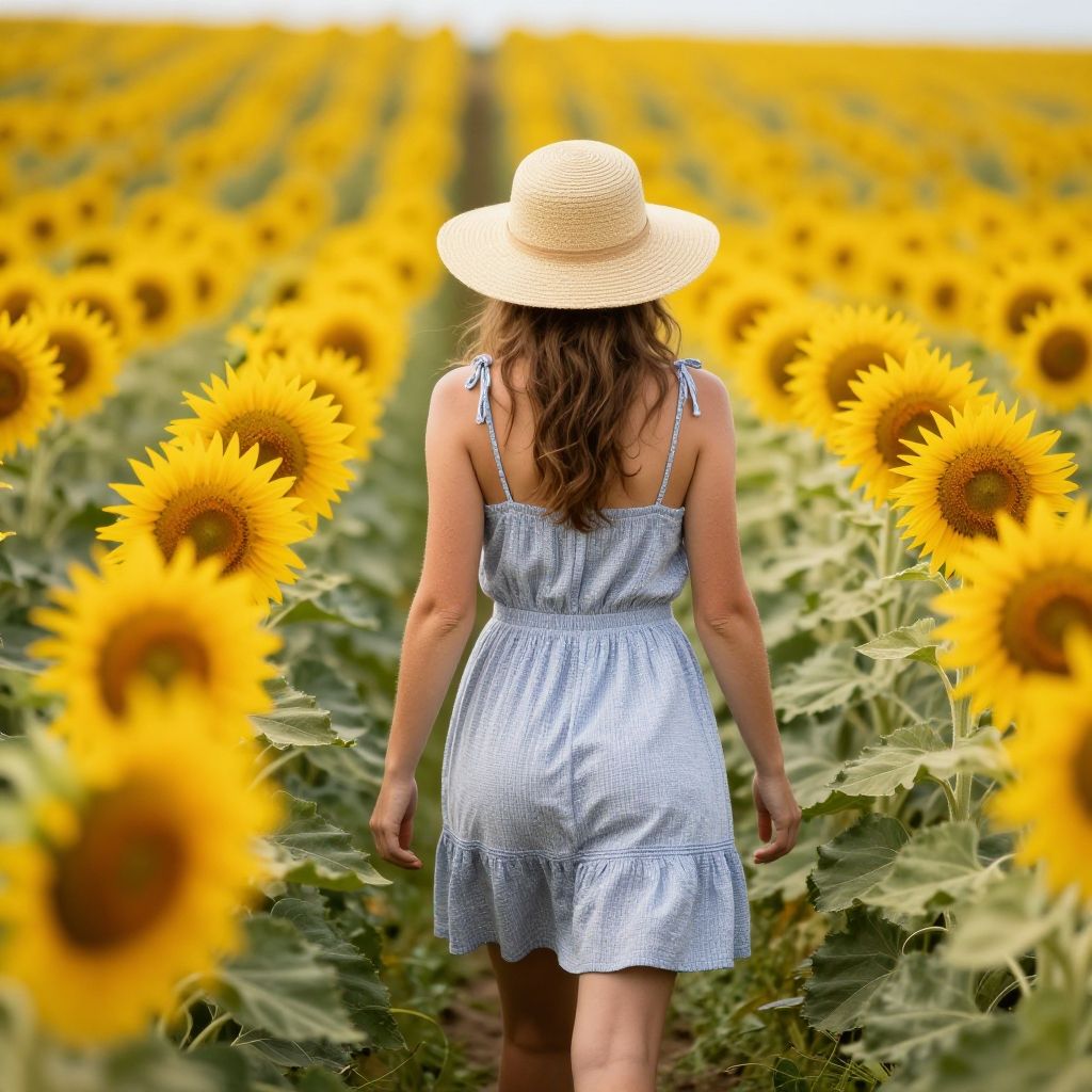 Woman Walking in Sunflower Field