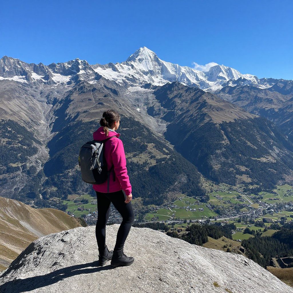 Photograph of a woman with a ponytail, wearing a dark purple jacket, black pants, and black boots, standing on a rocky outcrop in a snowy mountain landscape. She has a black backpack and is seen from behind, gazing at a range of snow-capped, jagged mountains under a clear blue sky. The foreground features a large gray rock, while the mid-ground is a mix of snow and dark green forest. The image captures the vastness and beauty of the mountain range, with bright sunlight illuminating the snow and shadows.