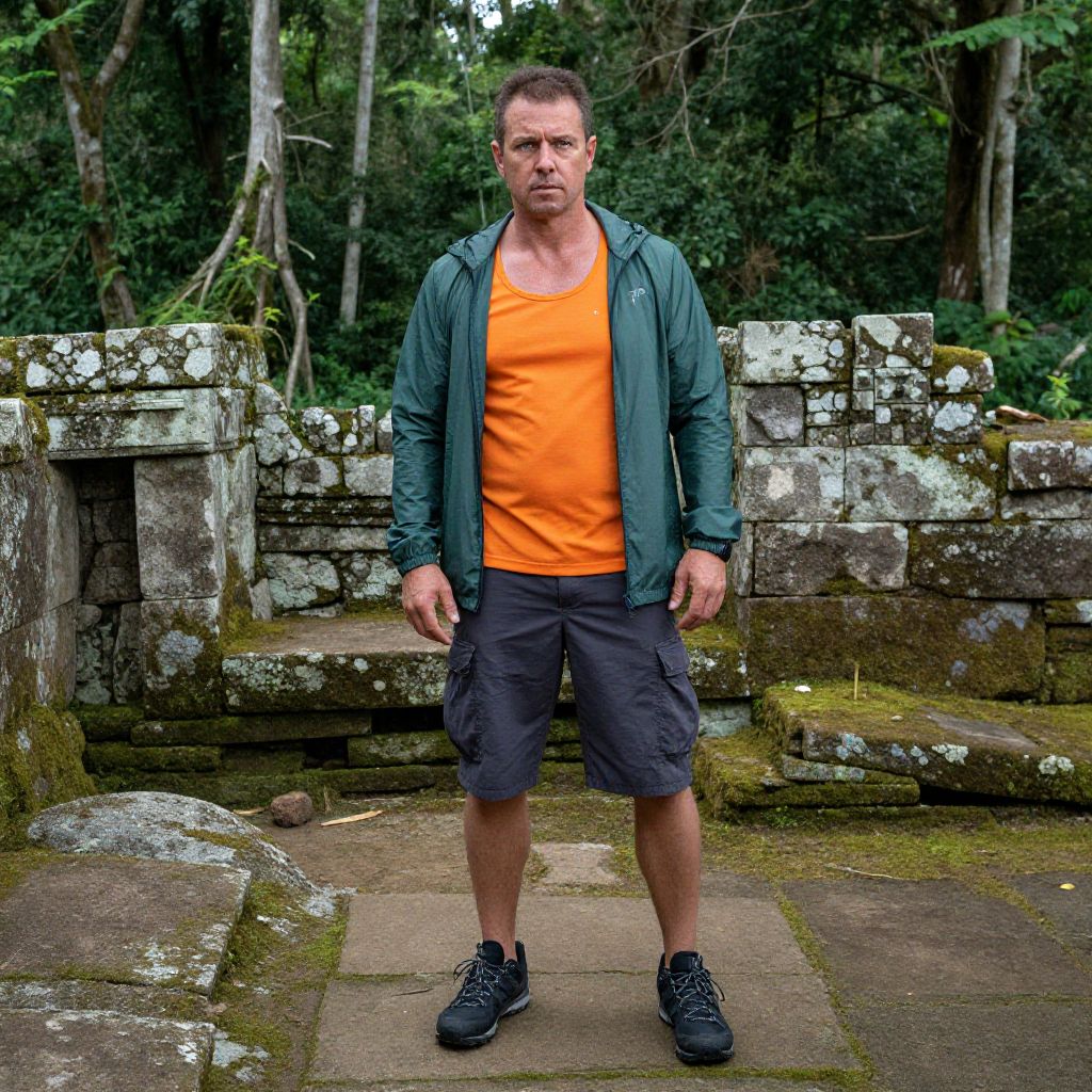 A man, bright orange performance cycling tank top, dark gray cargo cycling shorts, forest green lightweight windbreaker, black trail-ready trainers, ancient stone ruins, overgrown with moss, surrounded by dense jungle, lithographic film style, focused expression, ready for adventure. Man has masculine face and piercing eyes