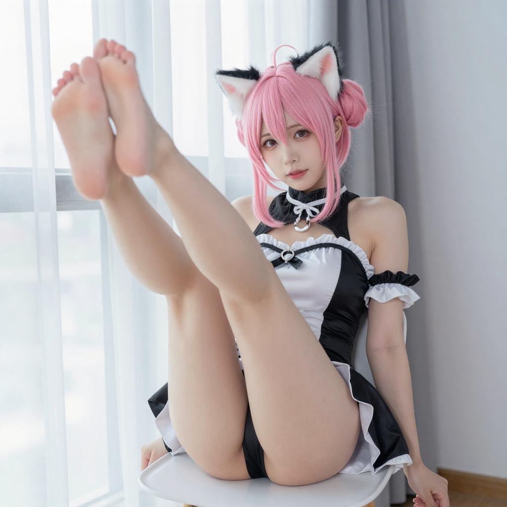 Photograph of a fair-skinned woman with purple and blue hair, wearing a white thong and cat ears, lying on her back with legs raised and spread, exposing her genitals. She has pink lipstick and a neutral expression. The background includes white curtains and a gray curtain.