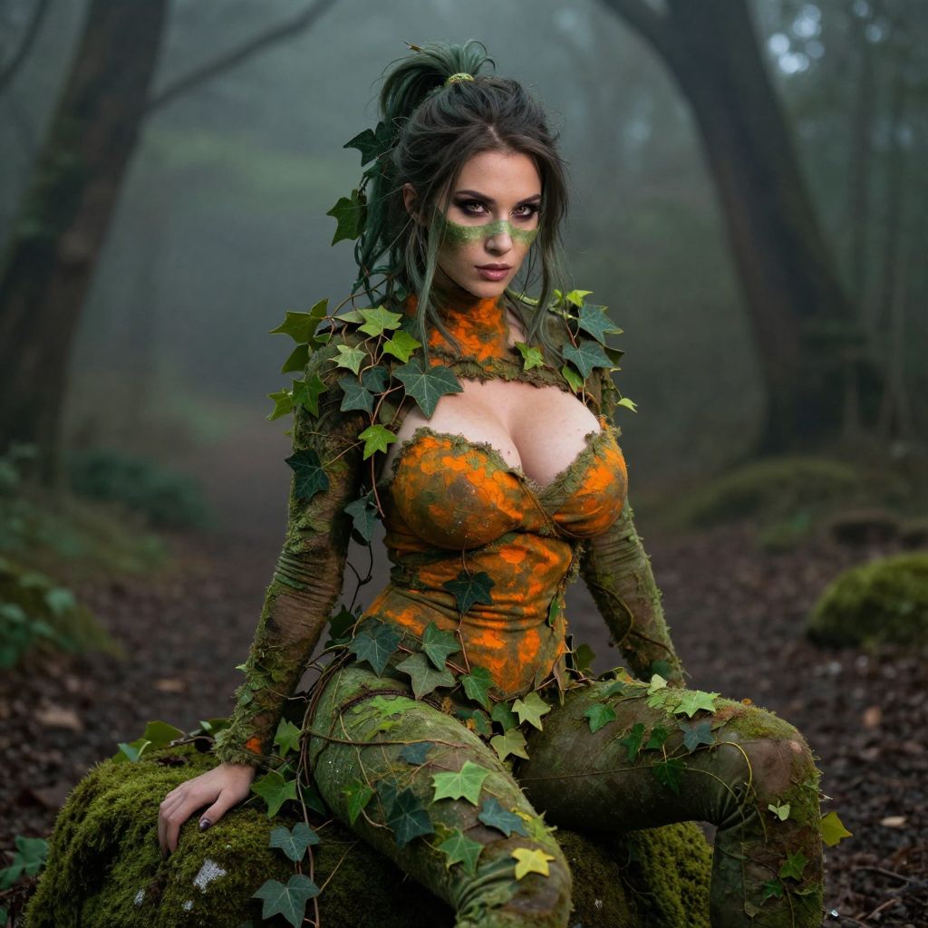 A cinematic-style portrait of a woman in a full poison ivy woman costume, with green and orange tones, wild hair tied back with vines, her face partially obscured by a mask that shows only her cold, intense eyes, sitting on a mossy stone in a misty wooded trail, the camera catching the subtle glow of dew on the ivy leaves nearby.. The woman has big tits and cute face